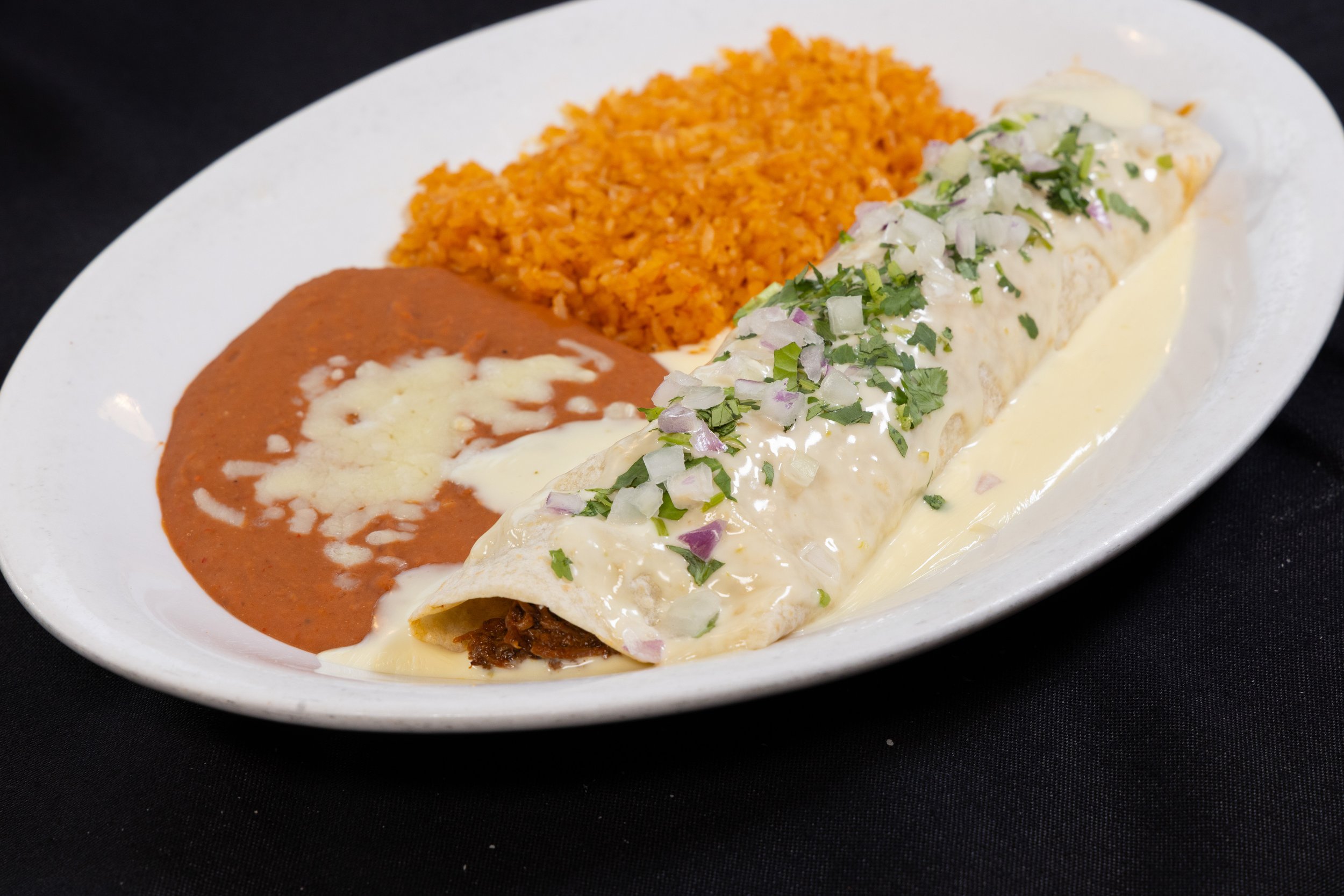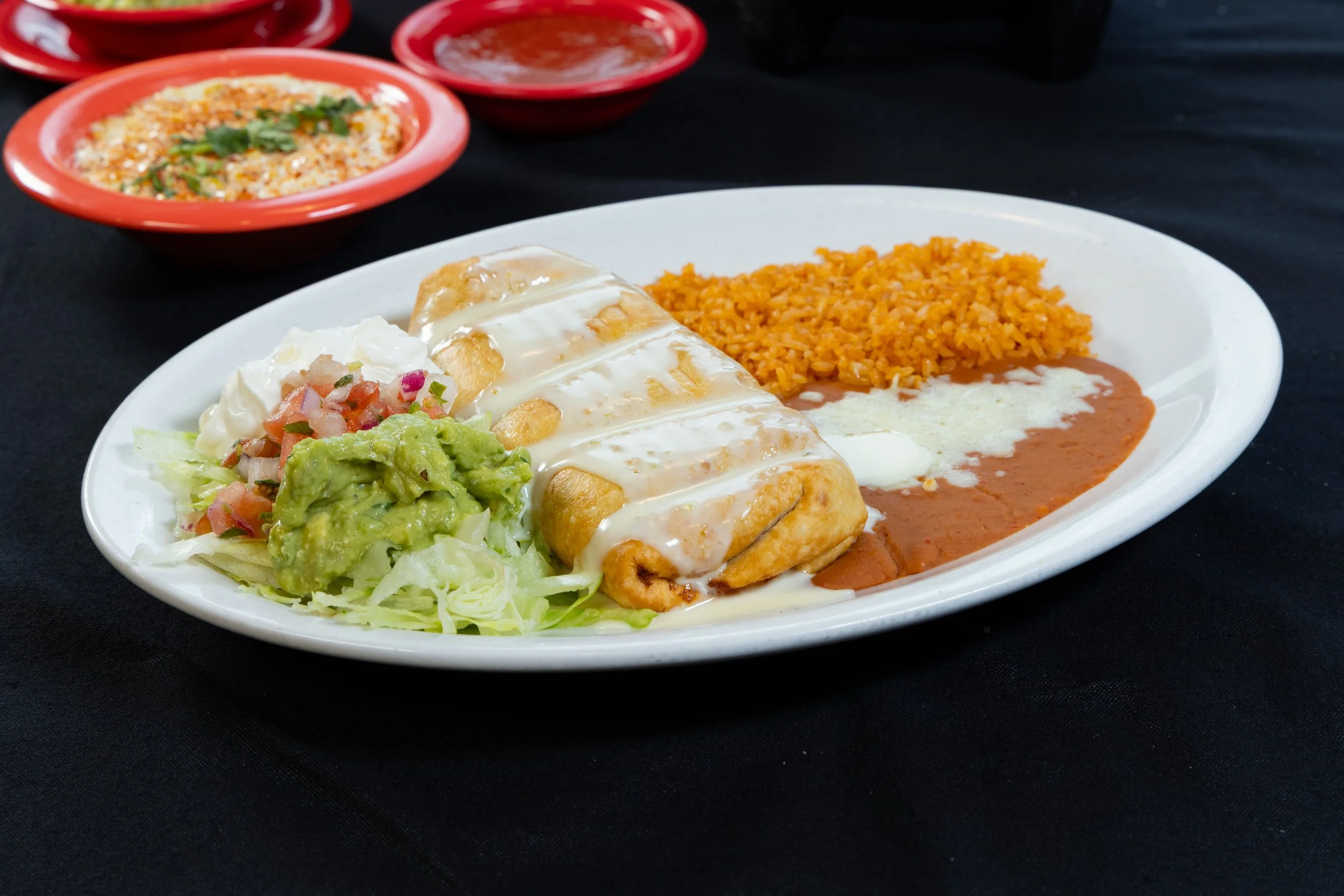 A flour tortilla stuffed with ground beef or shredded chicken, topped with burrito sauce, lettuce, tomatoes, sour cream, and shredded cheese. Served with rice and beans. 9.50